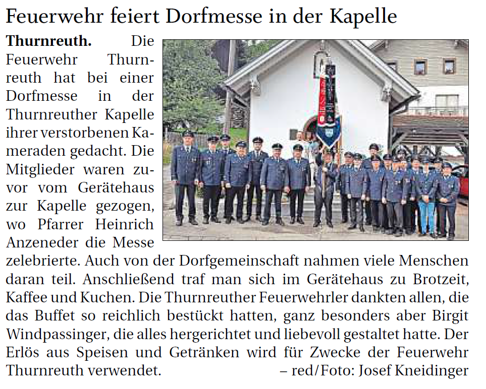Am 29.09.2017 wurde die jährliche Dorfmesse in unserer Thurnreuther Kapelle durch Hr. Pfarrer Anzeneder abgehalten. Dabei beteiligte sich auch die Thurnreuther Wehr mit einer starken Truppe. Nach der Messe lud die Feuerwehr alle Messbesucher zu Brotzeit und Kaffee und Kuchen ins Feuerwehrhaus ein. Dort wurde eine Spendenkasse zugunsten der Thurnreuther Kapelle aufgestellt und um eine freiwillige Spende gebeten. Die großzügige Spende von 400 € wurde anschließend dem Kapellenbesitzer Franz Kneidinger übergeben.