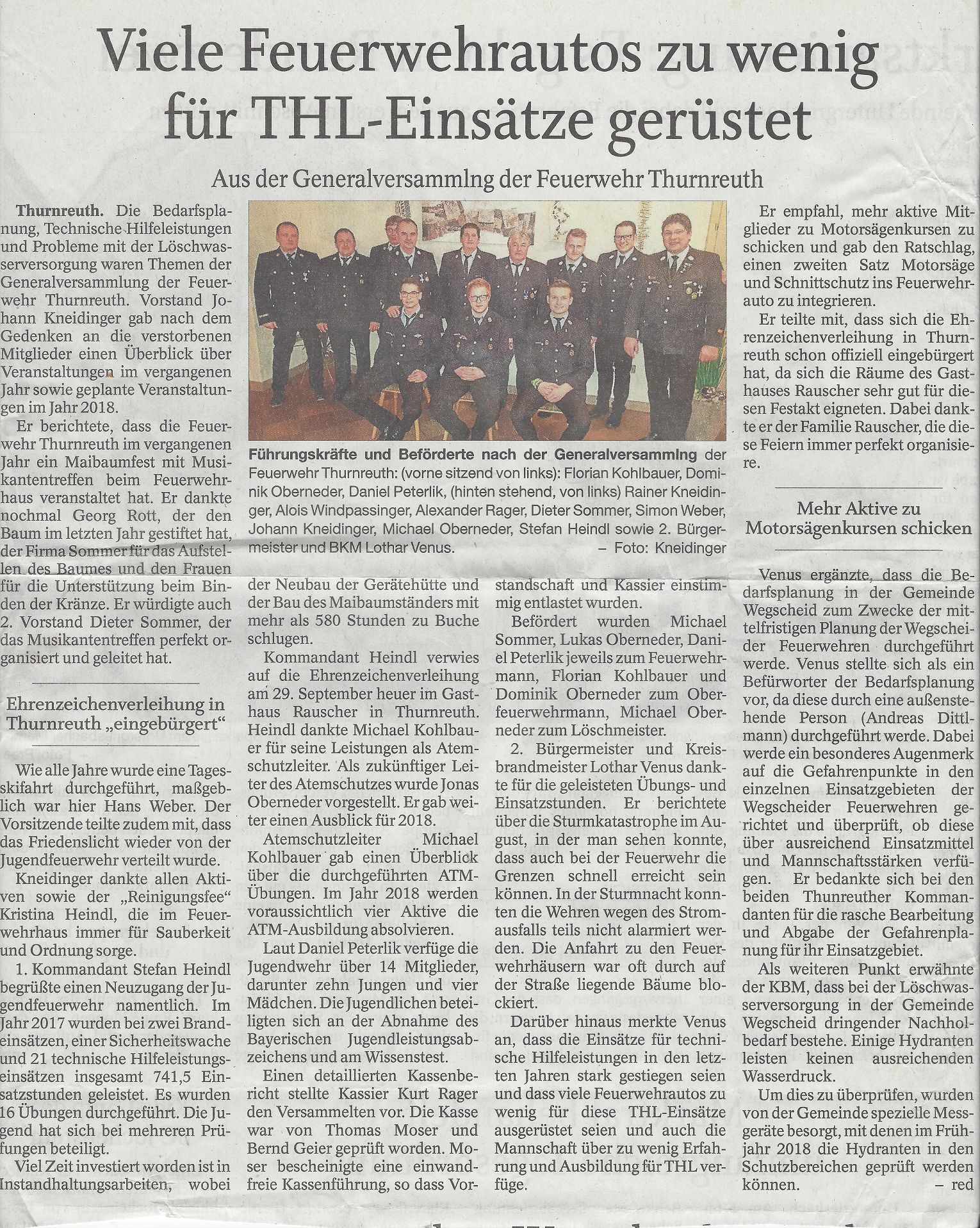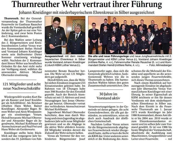Artikel zur Generalversammlung der FF Thurnreuth am 17.02.2018 im Gasthaus Rauscher.