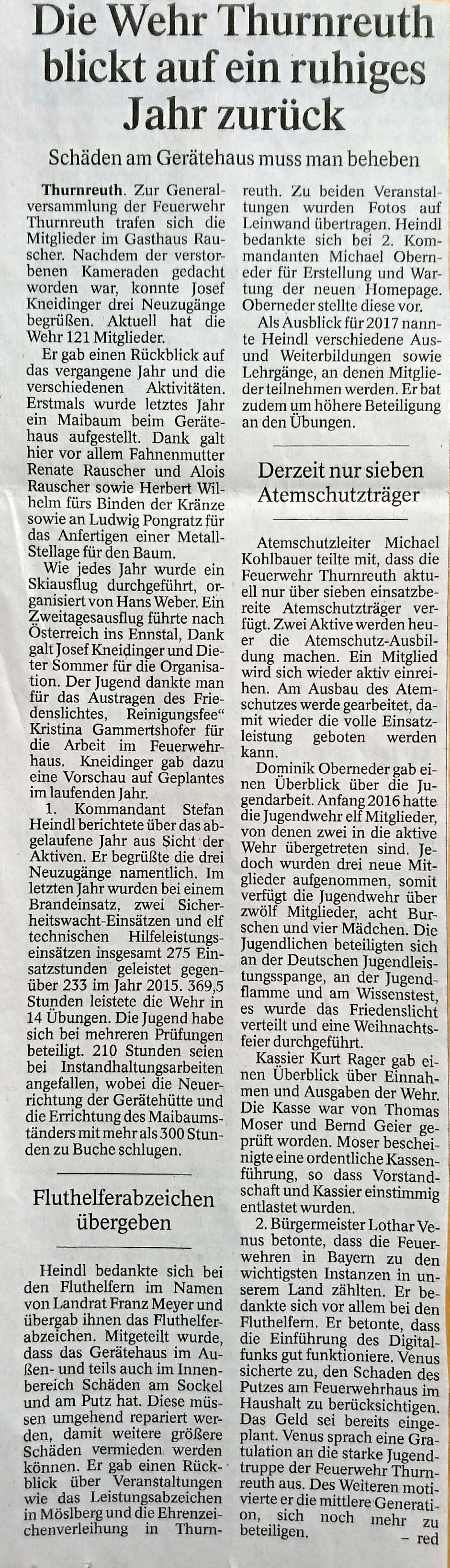 Artikel zur Generalversammlung 2016 der FF Thurnreuth
