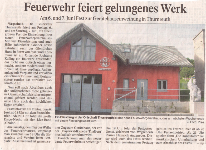 Artikel aus der PNP zur Fertigstellung des neuen Feuerwehrhaus Thurnreuth
