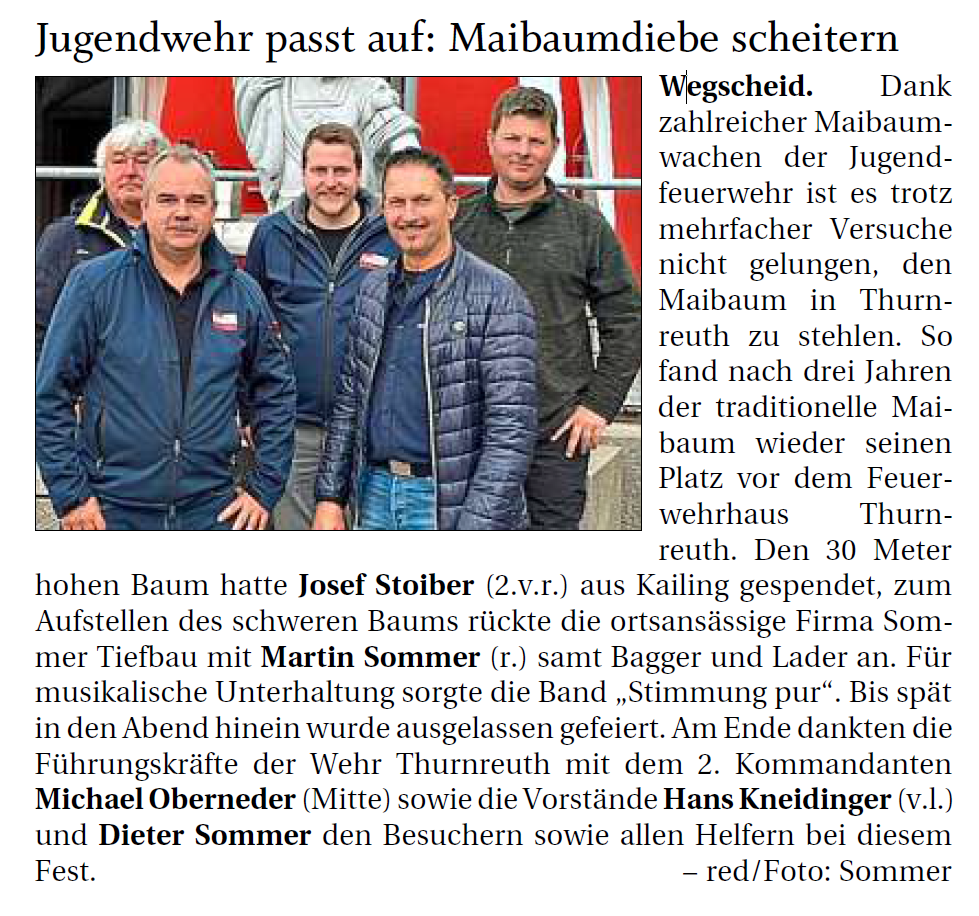 Die Freiwillige Feuerwehr Thurnreuth möchte sich recht herzlich bei allen Helfern bedanken. Besonderer Dank gilt vor allem dem Stifter des Maibaumes, Jürgen Kneidinger, und der Firma Sommer Tiefbau für die tatkräftige Unterstützung beim Aufstellen unseres Maibaumes.