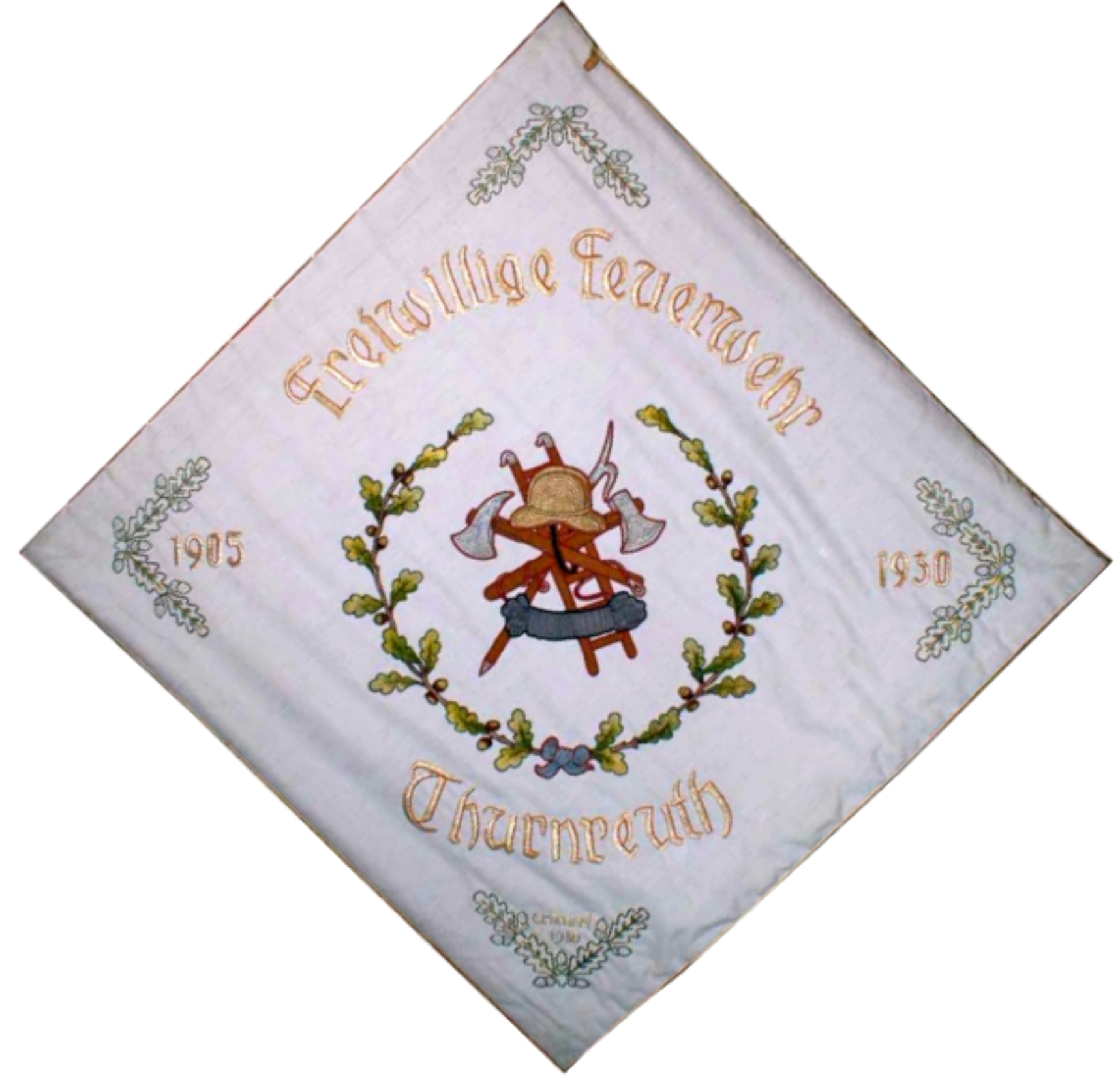 Die alte Fahne der Feuerwehr Thurnreuth. Angeschafft worden ist diese Fahne zum 25jährigen Gründungsfest im Jahr 1930. 1980 wurde sie aufwändig restauriert und bis 2005 war diese Fahne im Einsatz.