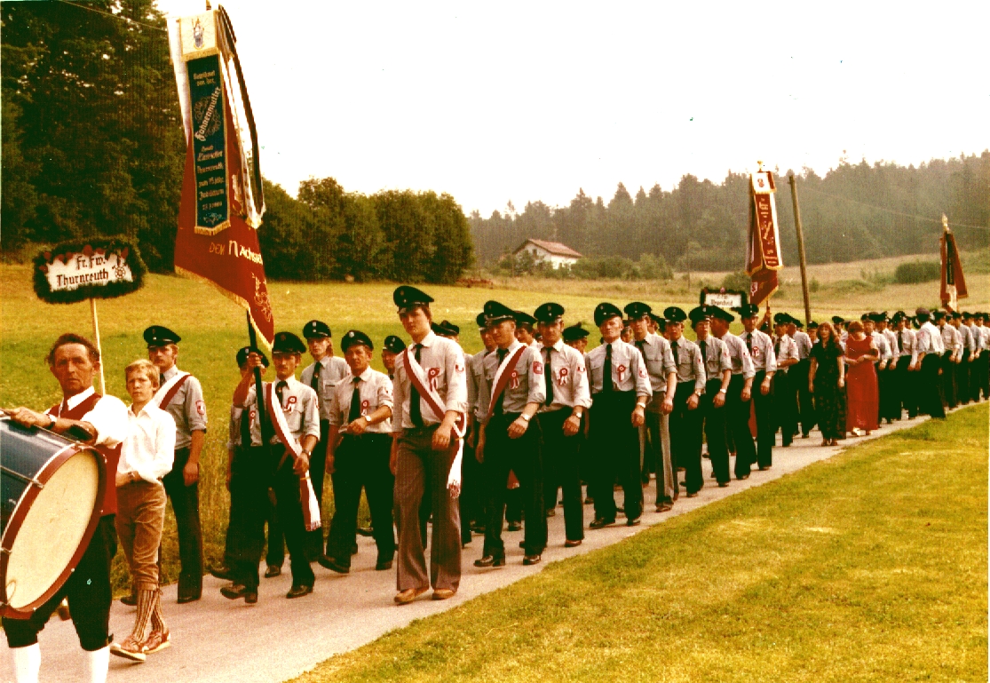 Das ist eine lange Zeit, und das muss natürlich gefeiert werden. Anlässlich dieses Jubiläums wurde ein großes Festzelt aufgebaut. 3 Tage lang wurde gefeiert. Neue Fahnenmutter wurde Renate Rauscher, die dieses Amt bis heute in Ehren hält. Geladen waren damals 41 Vereine. Laut PNP-Bericht war dieses Fest damals das größte, das jemals in Thurnreuth ausgerichtet wurde, außerdem war es ein prachtvoller Festzug mit über 40 Fahnen und mehreren Pferdekutschen.