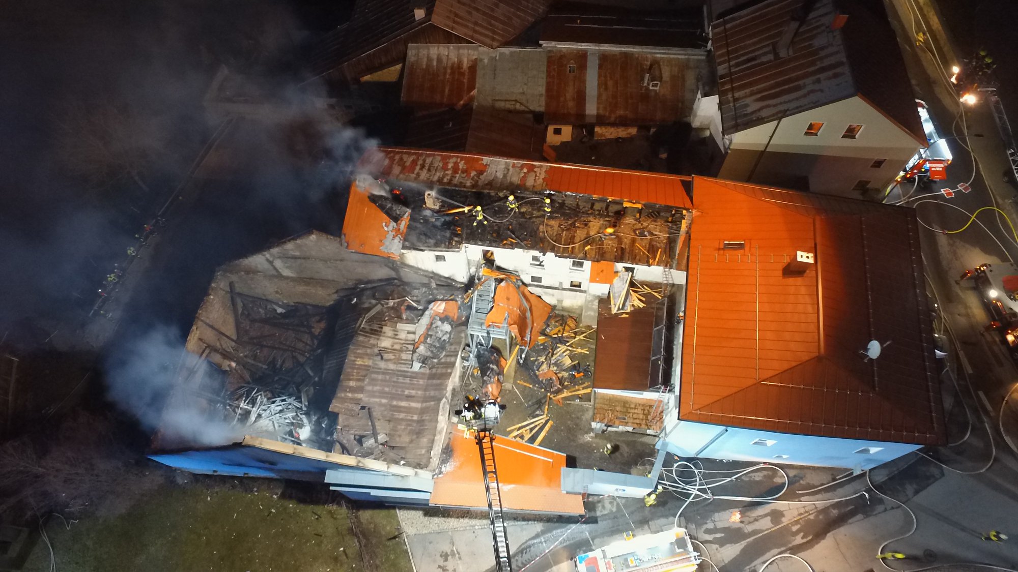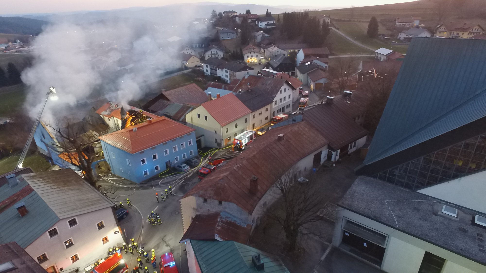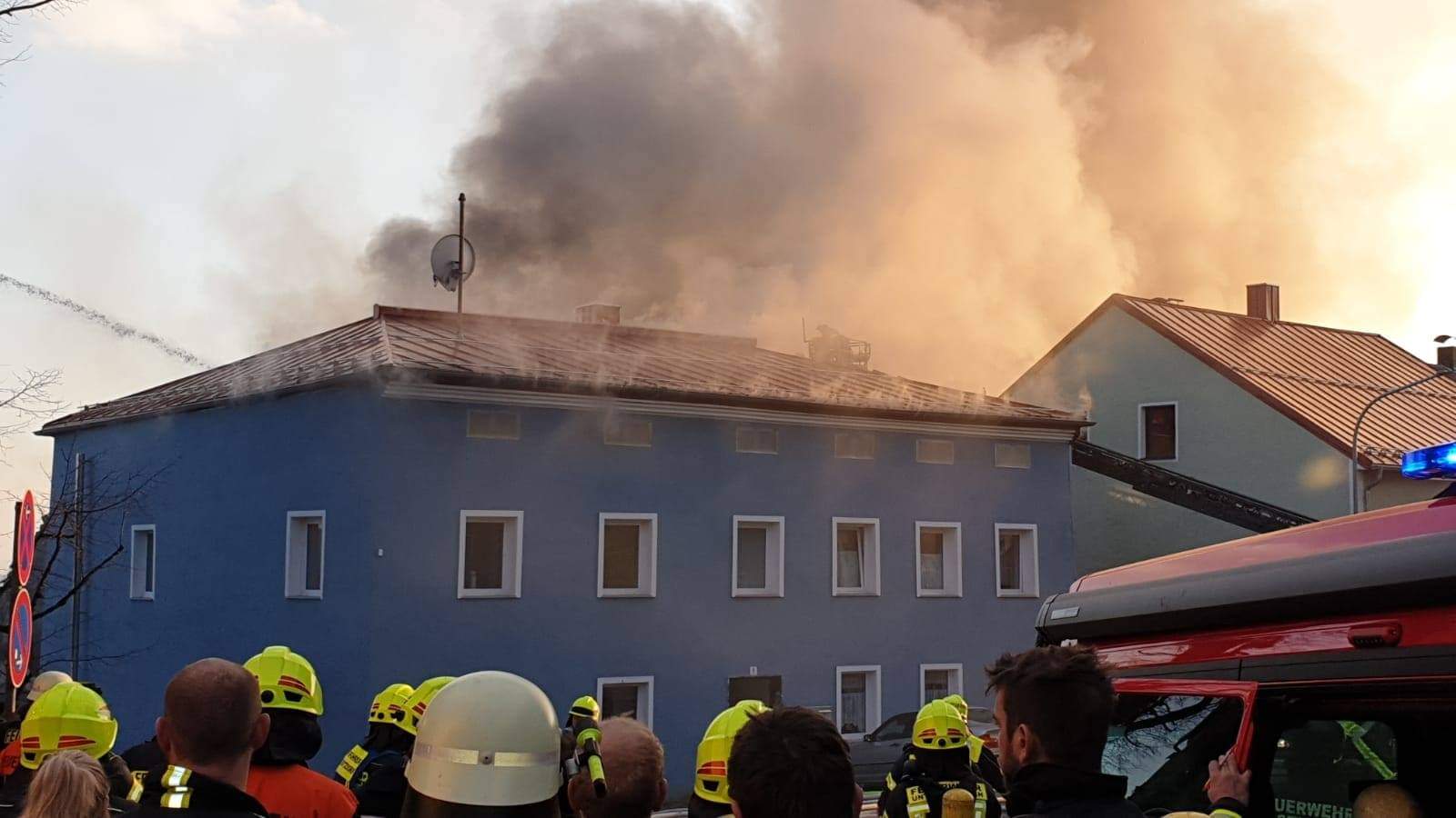 Wegscheid - Einen Großeinsatz für Wehren, Rettungskräfte und Polizei hat es am Donnerstag im Ortskern von Wegscheid im Landkreis Passau gegeben. Gegen 13.30 Uhr waren Polizei und Rettungskräfte alarmiert worden. Der Anbau an das frühere Wirtshaus "Zur Linde" stehe im Vollbrand. Das ehemalige Gasthaus war früher als Flüchtlingsunterkunft verwendet worden.